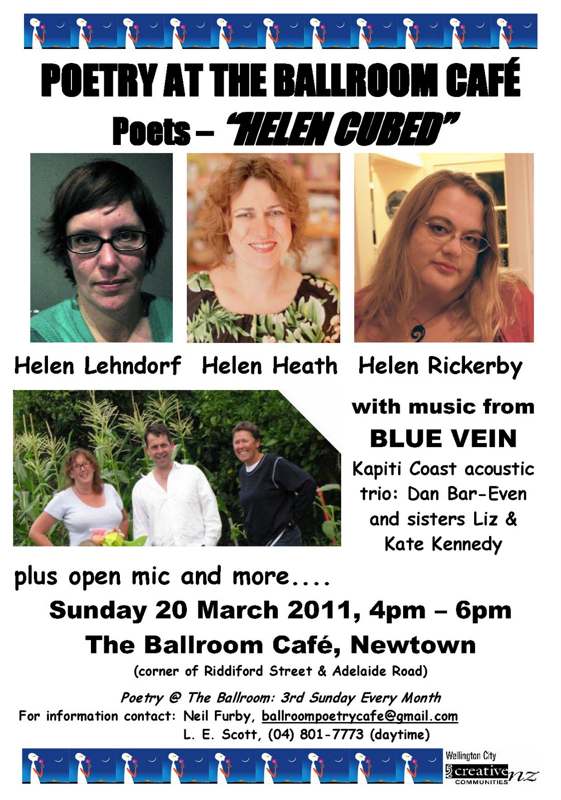 It'll all start with an open reading, followed by live music by Blue Vein (Dan Bar-Even, Liz & Kate Kennedy), followed by Helen Cubed. It will be awesome, because what could possibly be better than three Helens? (Four Helens I guess...)